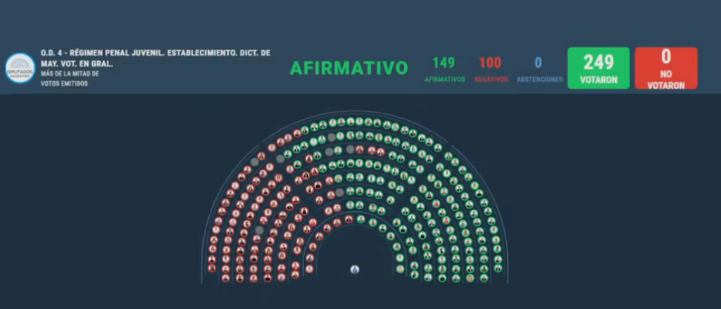 El nuevo Régimen Penal Juvenil, tiene entre sus puntos principales la baja de la edad de imputabilidad de los 16 a los 14 años. El proyecto impulsado por el oficialismo, cosechó 149 votos a favor y 100 en contra, sin abstenciones. El PRO, la UCR, Provincias Unidas, MID, Innovación Federal, Encuento Federal y Por Santa Cruz votaron a favor.