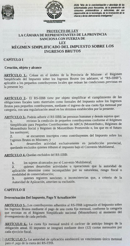 Según el texto del proyecto, el del Impuesto sobre los Ingresos Brutos (RS-IIBB) podrá ser adoptado por personas humanas y otros sujetos que revistan la condición de pequeños contribuyentes conforme el Régimen Simplificado para Pequeños Contribuyentes de ARCA —es decir, monotributistas—, que se encuentren inscriptos como contribuyentes en Misiones y que desarrollen actividad exclusivamente en jurisdicción provincial.