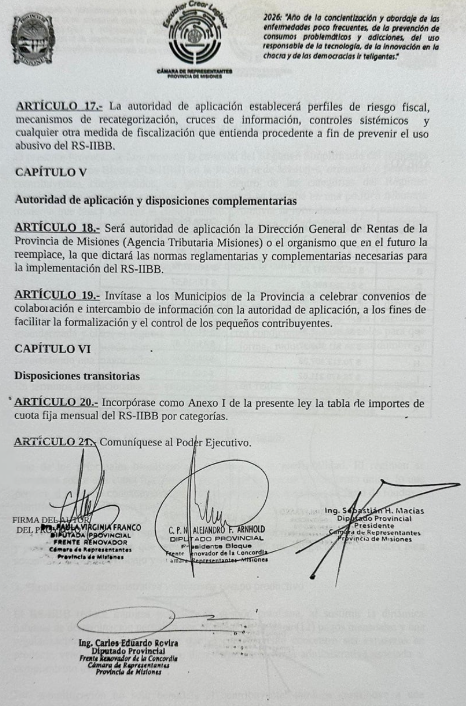 La iniciativa de Franco, cuenta también con las firmas del presidente de la Cámara, Sebastián Macías y de los diputados: Carlos Rovira y Alejandro F. Arnhold y, propone, reemplazar el esquema actual de declaraciones y percepciones por un sistema de cuota fija mensual por categoría, con el objetivo de reducir la carga administrativa sobre quienes producen y comercian a menor escala en la Provincia.