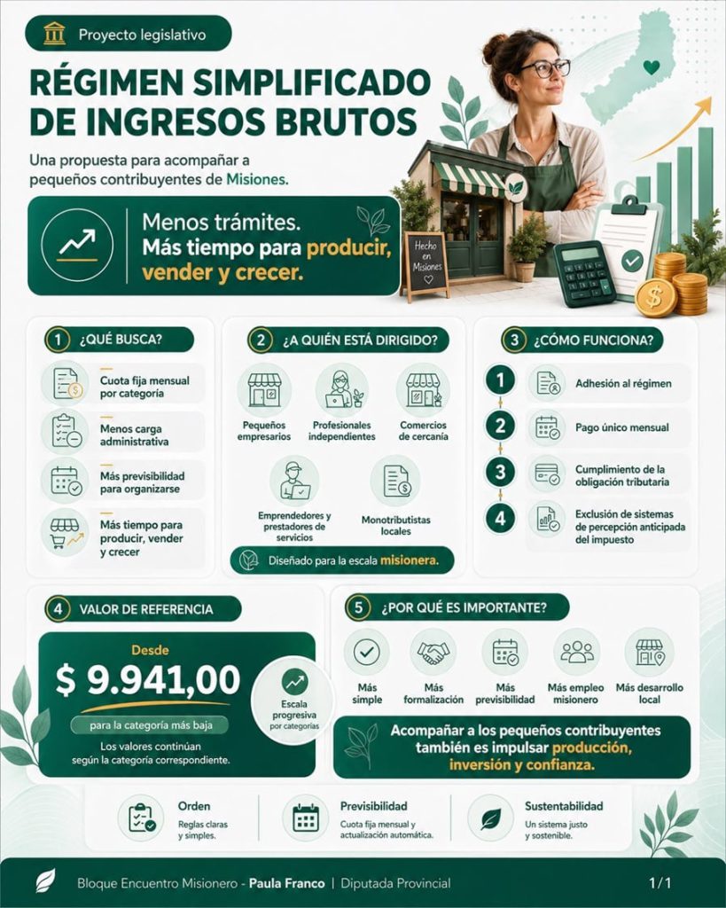 La legisladora provincial Paula Franco, presentó ante la Cámara de Representantes de Misiones, un proyecto de ley para crear el Régimen Simplificado del Impuesto sobre los Ingresos Brutos, destinado a los pequeños contribuyentes locales. La iniciativa busca reemplazar el esquema actual por un pago único mensual por categoría y eliminar los sistemas de percepción anticipada del impuesto.