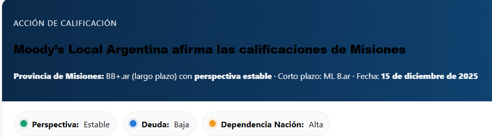 La decisión fue comunicada el 15 de diciembre de 2025 y también alcanzó a los compromisos de corto plazo, que permanecen en ML B.ar, así como a los títulos de deuda por 1.015,1 millones de pesos con vencimiento en 2031, que conservaron la misma nota. En la jerarquía de las calificaciones subnacionales argentinas, BB+.ar ubica a Misiones dentro del grupo de jurisdicciones con riesgo crediticio moderado y adecuada capacidad de pago, aún dentro de un país con elevada volatilidad macroeconómica.